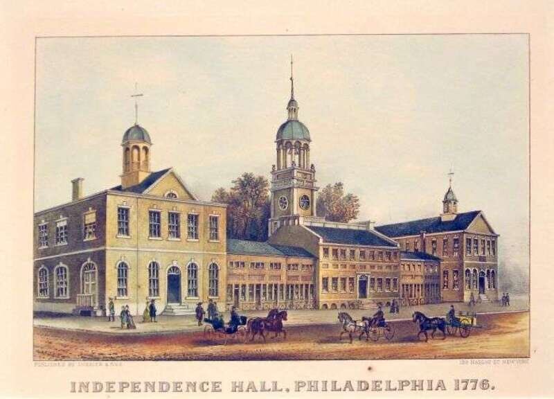 Hand-Colored Lithograph. Currier, N.; Ives, J.M., pub. "Independence Hall, Philadelphia." New York, n.d. [ca. 1870s]. 9 x 12 1/2 inches (229 x 317 mm) - image and text, full margins. Clean and bright. Framed.