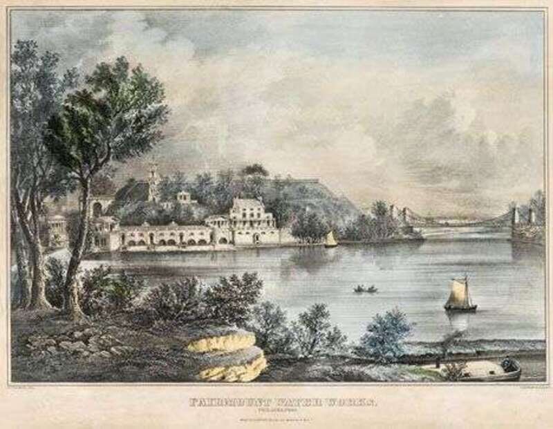 Hand-Colored Lithograph. Currier, N.; Ives, J.M., pub. "Fairmount Waterworks, Philadelphia." New York, n.d. [ca. 1860]. After F. F. Palmer. 12 x 15 1/2 inches (305 x 393 mm) - image and text, margins. Moderate toning and mat burn, minor wear to edges, small repairs. Framed.