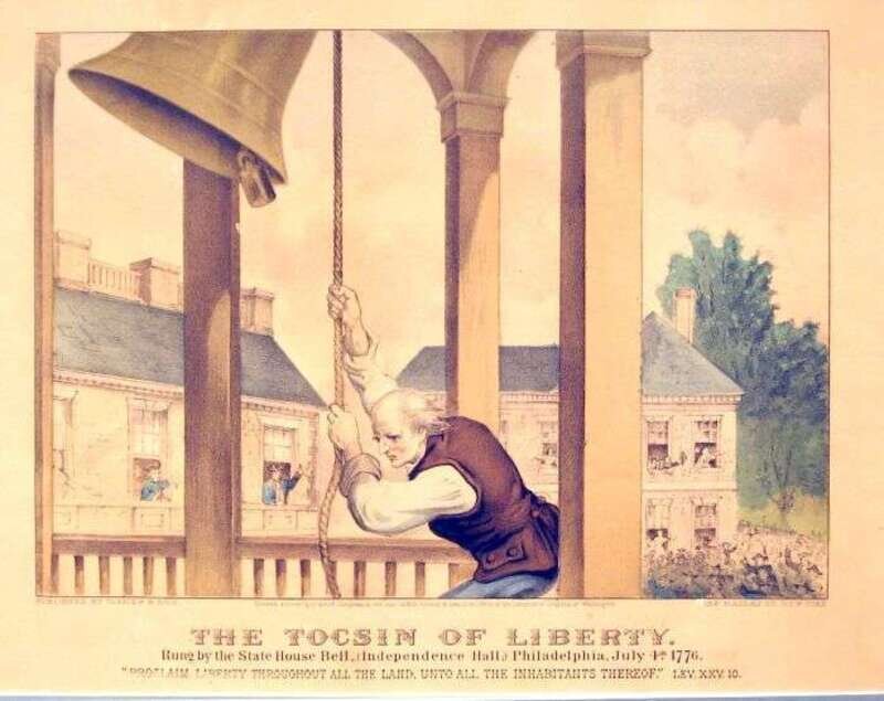 Hand-Colored Lithograph. Currier, N.; Ives, J.M., pub. "The Tocsin of Liberty, Rung by The State House Bell (Independence Hall), Philadelphia, July 4, 1776." New York, 1876. 10 1/2 x 12 1/2 inches (267 x 315 mm) - image and text, margins Slightly toned. Framed.