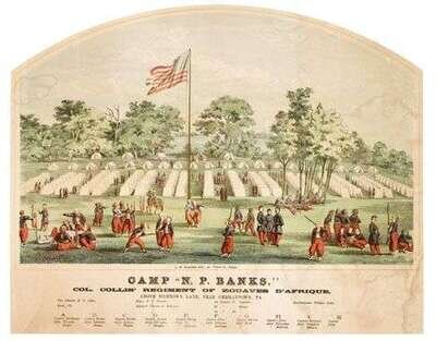 Lithograph Printed in Colors. Rosenthal, L.N. "Camp 'N.P. Banks,' Col. Collis' Regiment of Zouaves D'Afrique, above Nicetown Lane near Germantown, Pa." Philadelphia, n.d. [ca. 1861]. 17 x 30 1/2 inches (430 x 520 mm) - image and text, margins. Some toning and staining, mounted to board.