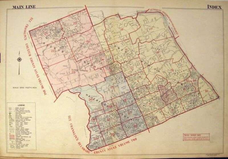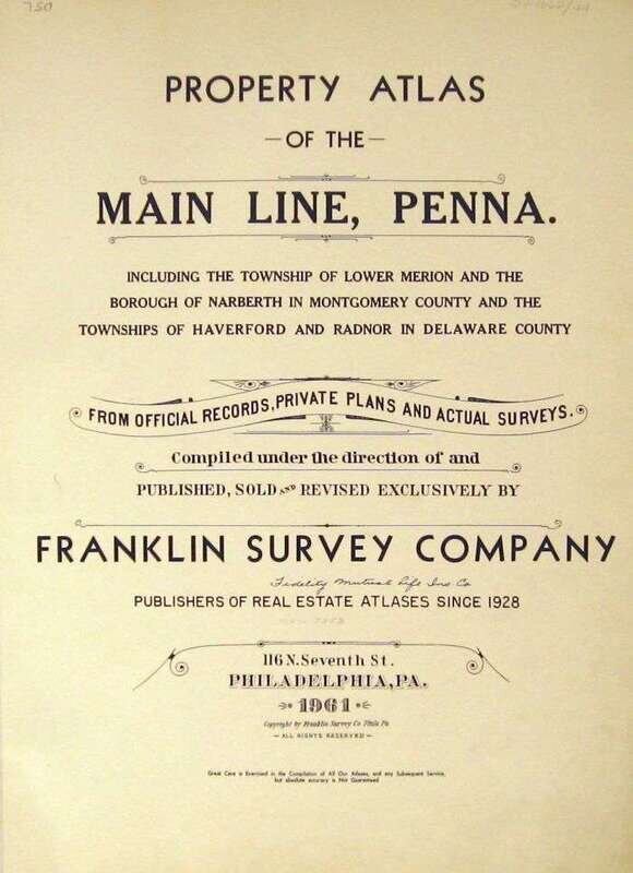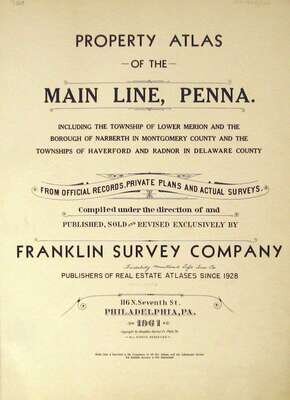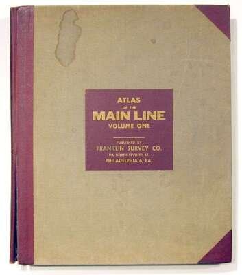 (Property Atlases.) Franklin Survey Company: Property Atlas of The Main Line, Penna.: Lower Merion... Narberth... Haverford and Radnor [Townships]. Philadelphia, 1961. Folio, orig. two-tone cloth; spine starting to separate. With double-page index map & 31 double-page, linen-backed color maps. Internally clean & crisp. * Property Atlas of The Main Line, Penna. Volume Two: Chester County Townships... Tredyffrin, Easttown, Willistown, East and West Whiteland, East & West Goshen... Borough of Malvern. Philadelphia, 1963. Folio, orig. two-tone cloth; spine starting to separate. With double-page index map & 28 double page linen-backed color maps. Internally crisp and clean.