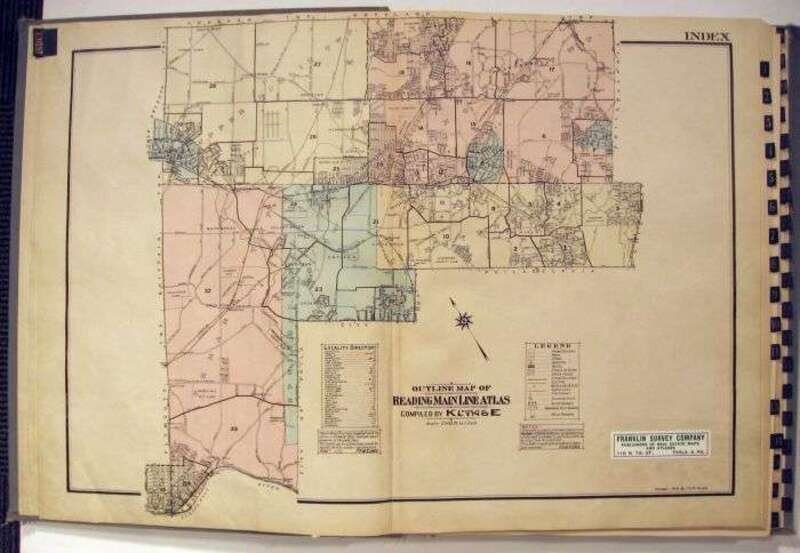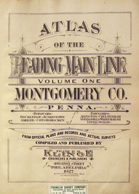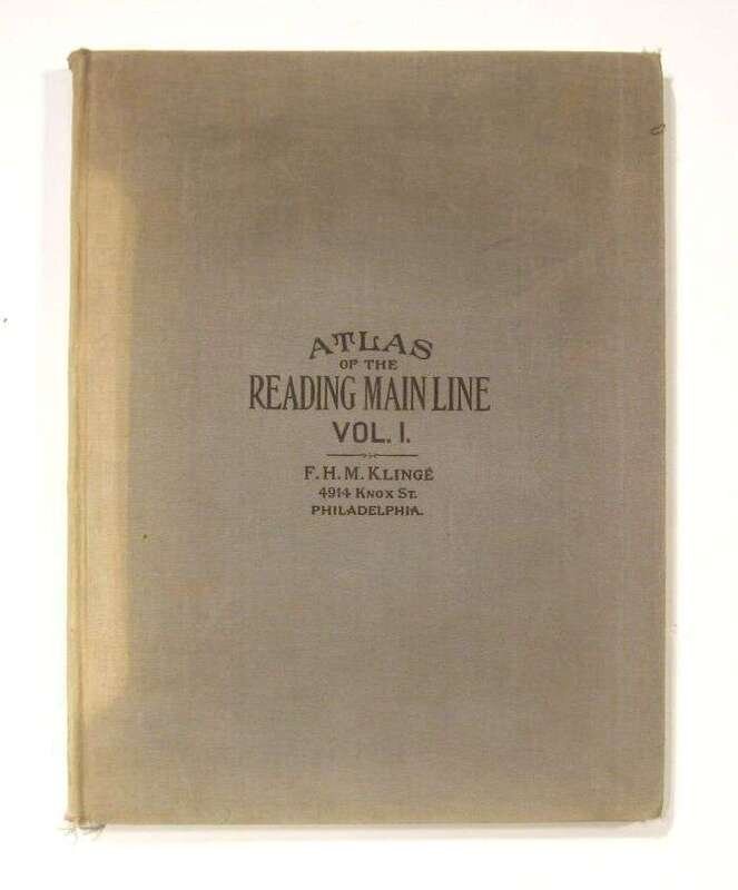 (Property Atlas.) Klinge, Frank H.M., pub. Atlas of The Reading Main Line. Volume One. Montgomery Co., Penn. Boroughs: Rockledge, Jenkintown, Ambler, Conshohocken; Townships: Abington, Cheltenham, Springfield, Whitemarsh, Upper Dublin. Philadelphia, 1927. Folio, orig. cloth; moderate wear, spine faded. With double-page index map & 35 double-page color maps. Street index chipped & with cellotape repair. Maps generally clean.