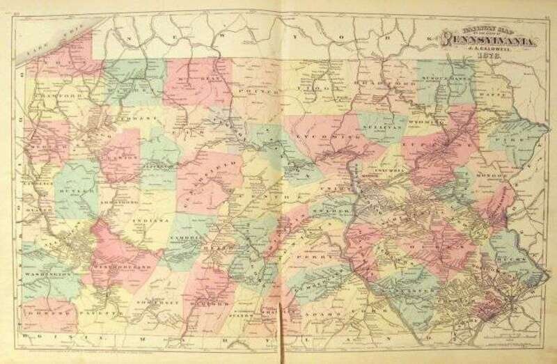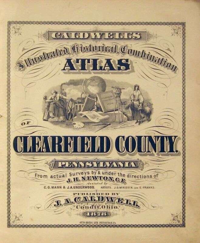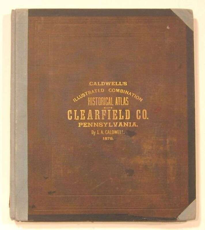 (Pennsylvania County Atlas.) Caldwell's Illustrated Historical Combination Atlas of Clearfield County, Pennsylvania. Condit, Ohio: J. A. Caldwell, 1878. Folio, orig. gilt-lettered cloth, re-backed, new corners and endpapers. Color maps (incl. fold. maps), plain lithographic views. Occasional small tears, some dustsoiling to front matter. Ex-library - blind stamp at foot of title page, other makings on endpapers and fore-edge.