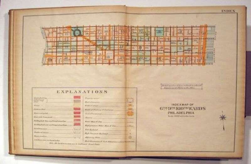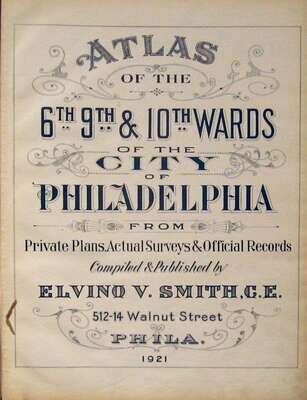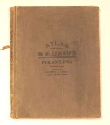 (Property Atlas.) Smith, Elvino V, pub. Atlas of The 6th, 9th, & 10th Wards of The City of Philadelphia. Philadelphia, 1921. Folio, orig. cloth; moderate wear. With double-page index map & 27 double-page color maps. Scattered close tears to a few margins. Maps generally clean. Vine to Chestnut Streets, Schuylkill to Delaware Rivers.