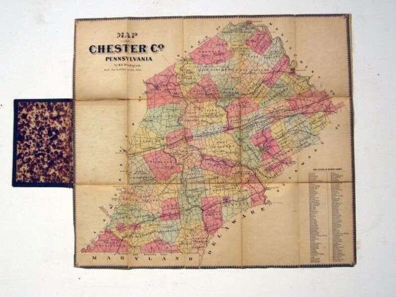 (Folding Map.) Bridgens, H.F. "Map of Chester Co., Pennsylvania." N.p., [ca. 1880-1900]. Color lithographic map, 19 7/8 x 20 7/8 inches (504 x 530 mm). Slightly browned.