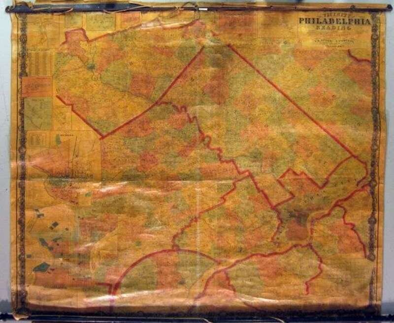 Laminated Linen-Backed Roll Map. Lake, D.J.; Belis, N.S. "A Map of The Vicinity of Philadelphia and Reading." Philadelphia: C.K. Stone, A. Pomperoy, 1860. 58 x 67 1/2 inches (1470 x 1715 mm). Occasional chipping, no loss to body of map, marginal dampstaining. Original wood roll.