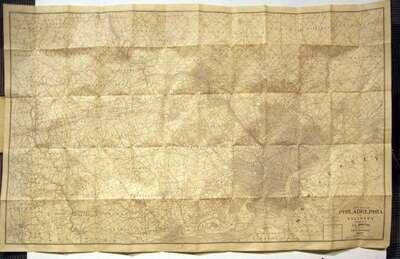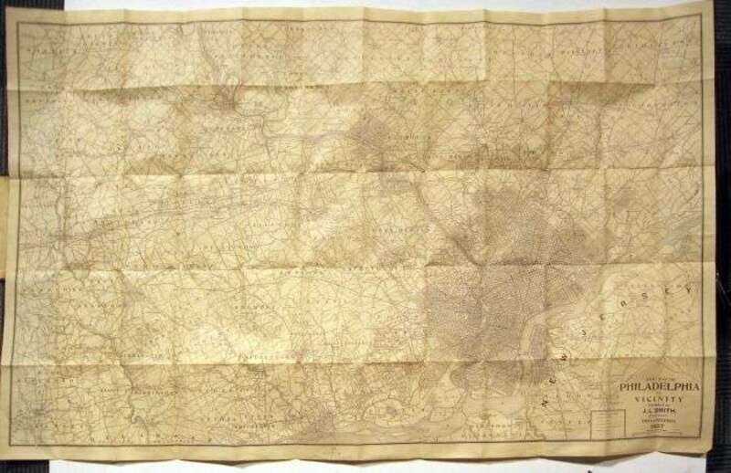 Linen-Backed Map. Smith, J.L., pub. "A New Map of Philadelphia and Vicinity." Philadelphia, 1907. Orig. brown cloth casing with paper label, fold linen-backed map, 27 3/4 x 43 3/4 inches (704 x 1110 mm). Crisp & clean.