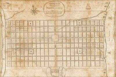 Engraved Map. Holme, Thomas. "A Portraiture of The City of Philadelphia in The Province of Pennsylvania in America." London, [1683]. [But reprinted, Philadelphia, 1812]. 11 3/4 x 17 3/4 inches (298 x 450 mm). Moderate foxing, occasional dampstaining. Printed from the original (1683) copper plate, to which slight alterations were made in 1812. The original plan of the city of Philadelphia. Framed.