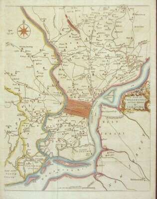 Hand-Colored Engraved Map. Scull, N.; Heap, G. "A Map of Philadelphia and Parts Adjacent." [London: Gentleman's Magazine, Dec, 1777.] 13 1/4 x 11 1/2 inches (36 x 292 mm) - wide margins. Minor creasing. Old color. Old Print Shop, New York, frame and label before 1963.