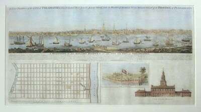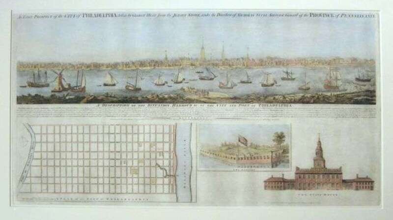 Hand-Colored Engraving. Jeffreys, Thomas after Heap, George and Scull, Nicholas. "An East Prospect of The City of Philadelphia. [London], [1756] [but Philadelphia, 1982.] 19 3/4 x 36 7/8 inches (500 x 936 mm). Clean. Framed. Restrike pulled in 1982 from the original copper plate.