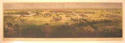 Hand-Colored Wood Engraving. "United States International Exhibition, Bird's Eye View of Fairmount Park, Showing The Centennial Buildings in Course of Construction, The Grounds, The City of Philadelphia and Surrounding Country." N.d., [ca. 1875]. 15 1/4 x 47 1/2 inches (387 x 1206 mm). Clean. Matted.