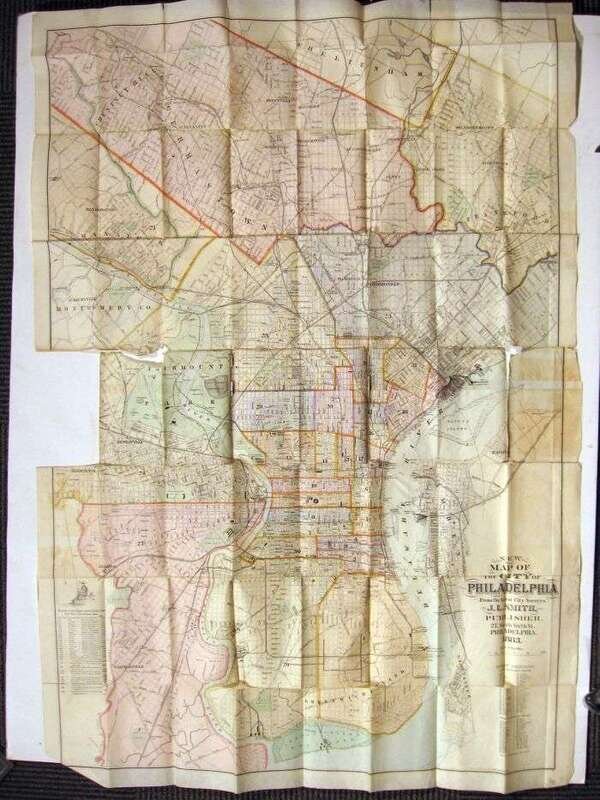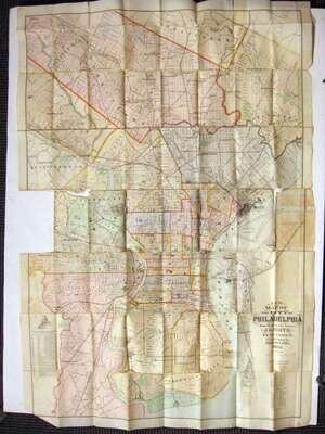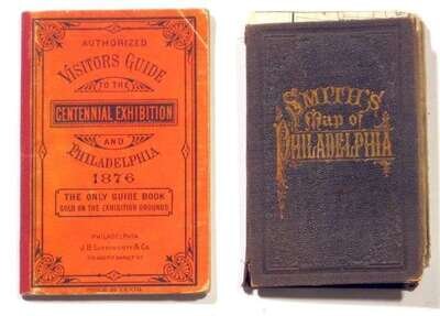 Philadelphia 19th-Century Maps & C.: A Visitor's Guide to The Centennial Exhibition at Philadelphia. Philadelphia: J.B. Lippincott, (1876). 12mo, orig. flexible orange bds.; some creasing & edge wear. With 2 fold. maps, wood-engraved vignettes in text. Internally generally clean. * Smith, J.L., pub. "A New Map of The City of Philadelphia." Philadelphia, 1883. Orig. gilt-lettered brown cloth casing. Fold. color map, 41 x 29 1/2 inches (1040 x 750 mm). Several tears along folds, scattered small areas of paper loss, 1 section (6 x 4 inches) adhering to casing & torn away from rest of map (now loose). Sold with all faults.