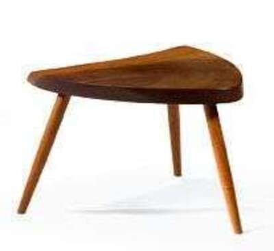 Walnut with triangular free form shape atop three turned and tapering legs. Signed underneath table top 'Mira Nakashima 7.8.91' (smaller table).