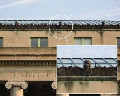 Copper architectural roof decorations unveiled at the Pennsylvania State Education Building in November 1931.