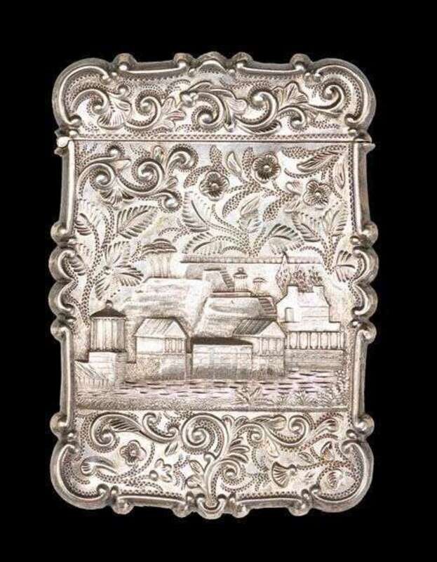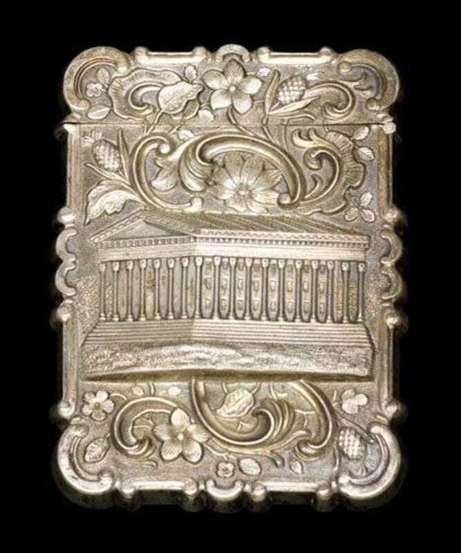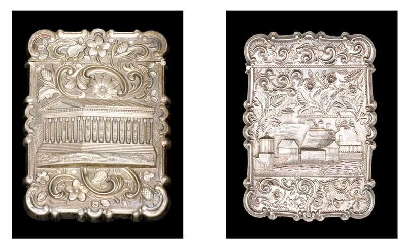 The first depicting the Philadelphia Waterworks with repousse and engraved foliate decoration surround, church with scroll and leaf decoration on verso; the other case depicting Founder's Hall, Girard College within a floral and foliate surround, marked 'L&W.'.