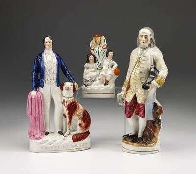 Including: a figure of Benjamin Franklin, a figure of the Prince of Wales with seated dog, and a couple with slip-vase.