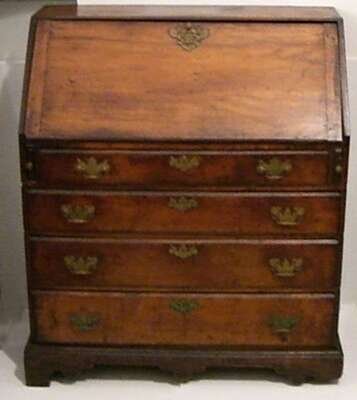 With hinged slant front opening to an arrangement of eleven drawers and four pigeonholes above four drawers and central drop terminating in bracket feet.