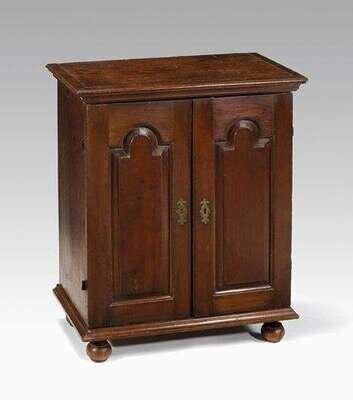 The flat molded cornice above two recessed arched panel doors opening to eighteen drawers, in sizes, on a molded base with ball feet.