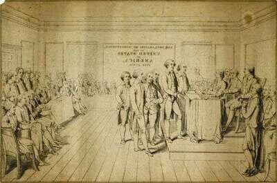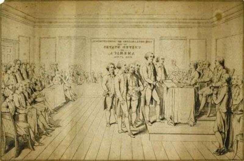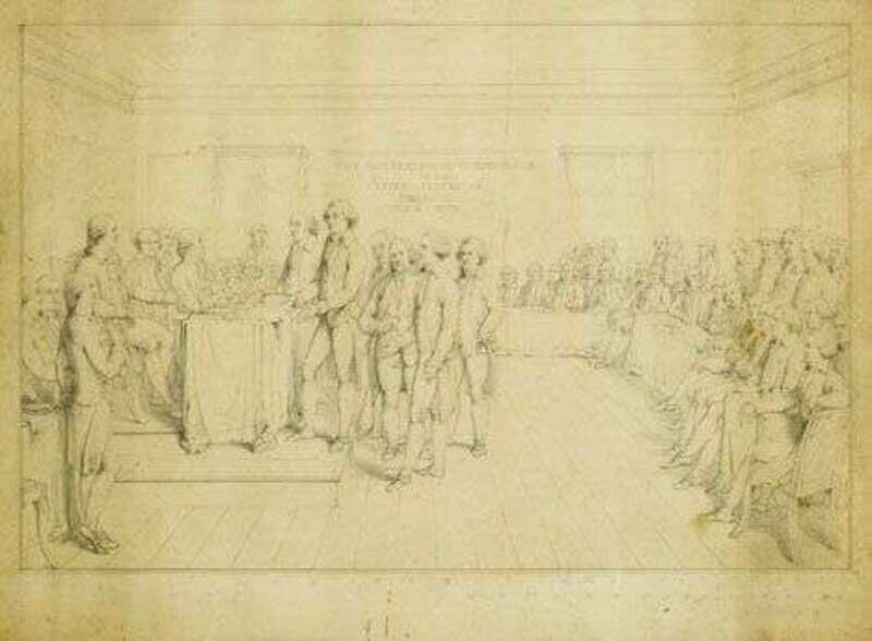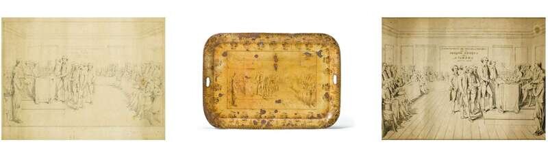 The oblong form printed with the scene 'The Declaration of Independence United States of America July 4th 1776,' enclosed by a band of cornucopia and floral border; together with a graphite sketch of this scene and the scene drawn in reverse for the printing process, and a printed key to the figures in the scene.