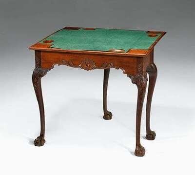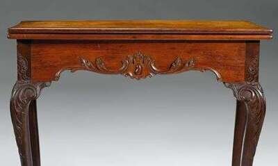 The rectangular top with conforming hinged leaf opening to a lined playing surface with rectangular inset candle stick recesses and oval counter recesses above a shaped skirt carved with acanthus leaves centering a cabochon pendant, the corners carved the cross-hatching and 'c'-scrolls continuing to acanthus leaf-carved cabriole legs ending in ball and claw feet; the swing rail reveals a hidden drawer.