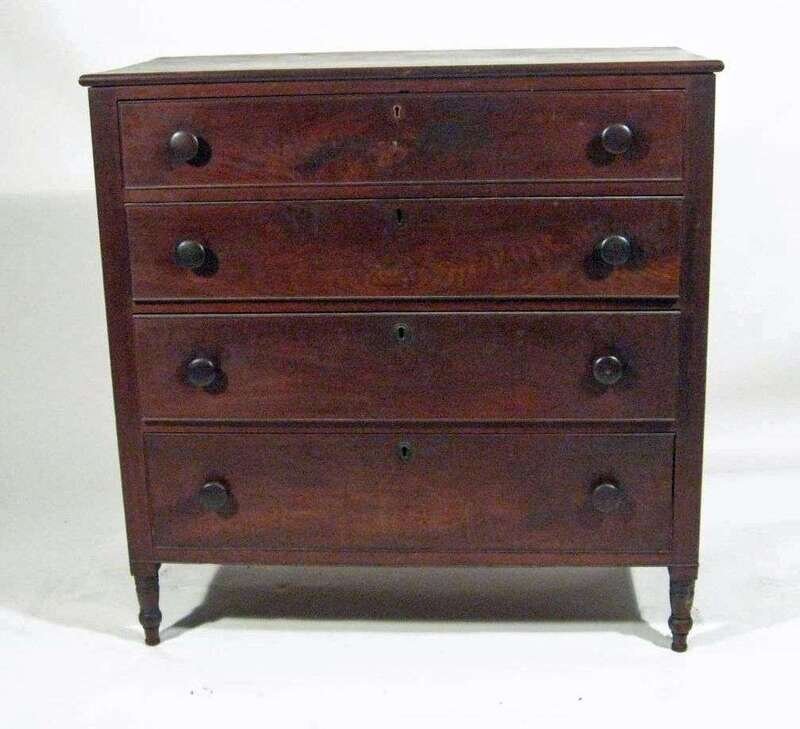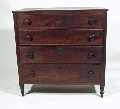 With rectangular top surmounting a conforming case housing four graduated drawers, resting on turned legs.
