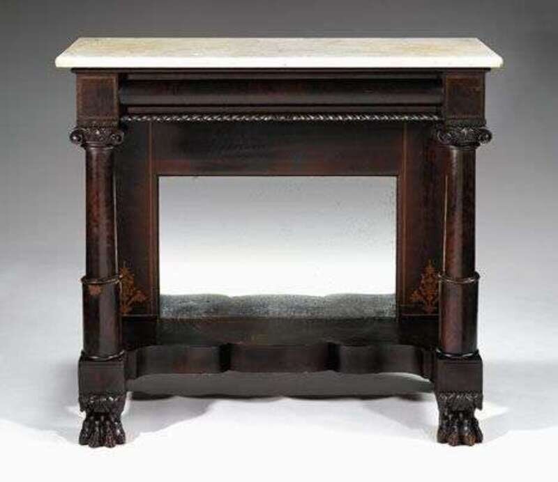 Marble top over bolection molded and gadrooned apron, flanked by Ionic columns on shaped base with leaf and lion paw feet; retains original mirror plate and stenciling, 'Abraham See and Mary Falaise Sarchet See, Philadelphia, Pennsylvania.'.