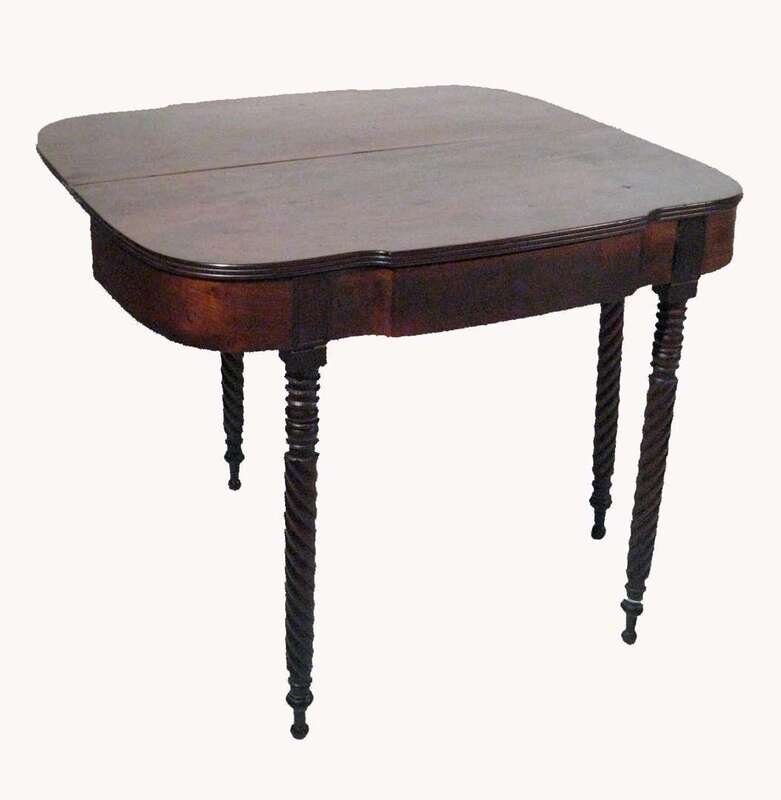 The serpentine hinged top with reeded edge over conforming apron resting on ring and spiral-turned legs ending in peg feet and casters.