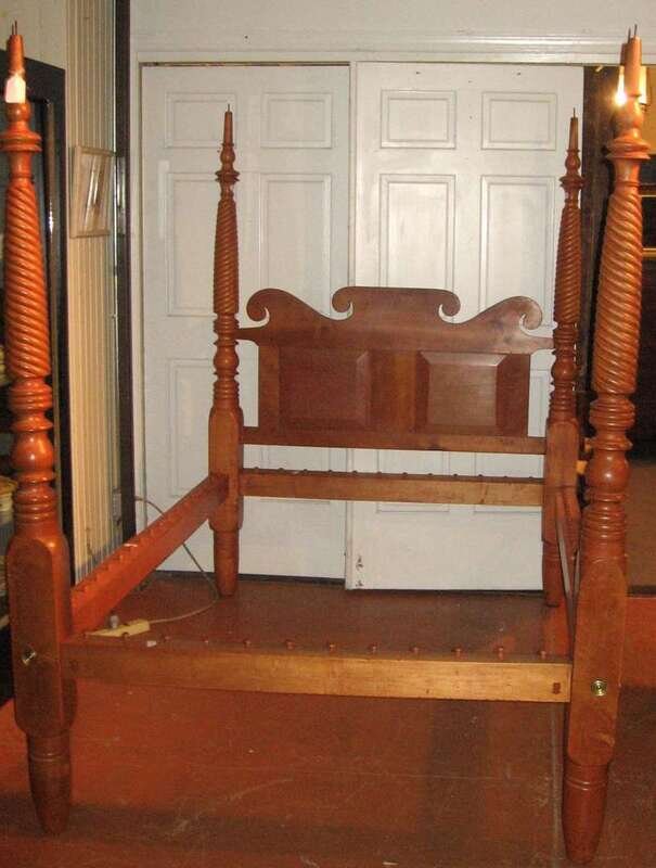 Headboard with scrolled top over two panels and twist and baluster turned posters.