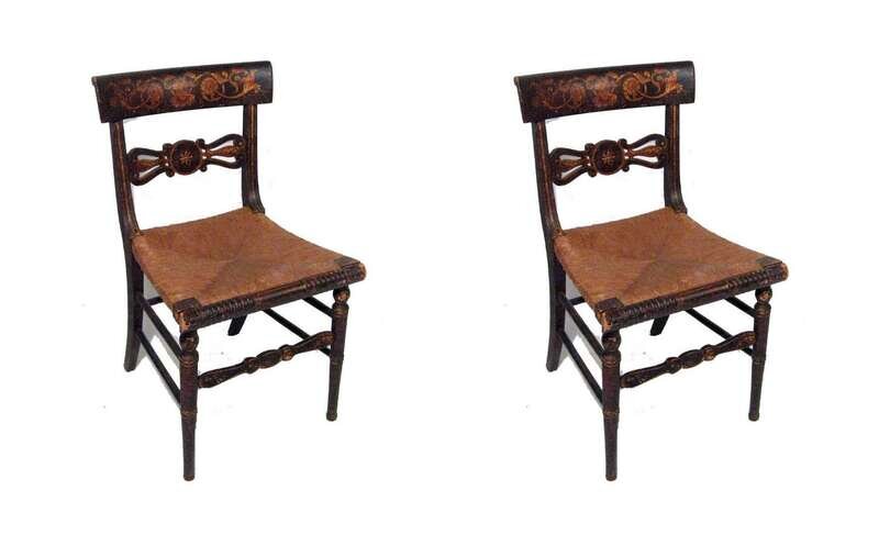Tablet crest rail decorated with a floral motif above a carved and painted slat surmounting a rush seat terminating in turned front legs and saber rear legs supported by side and painted front stretchers.
