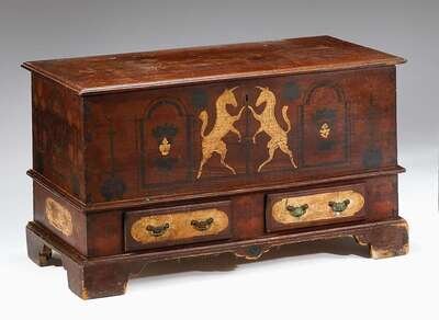 With rectangular molded top above conforming chest above two short drawers on molded base with drop apron and bracket feet; painted to show two unicorns respectant, flanked by symmetrical floral motifs, with floral imagery to all sides.