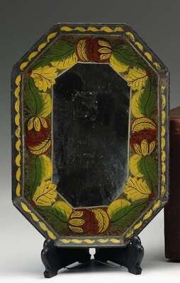 Of shaped octagonal form, painted to depict stylized fruit and flowers on a black ground.