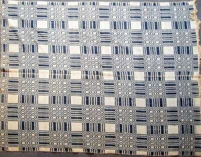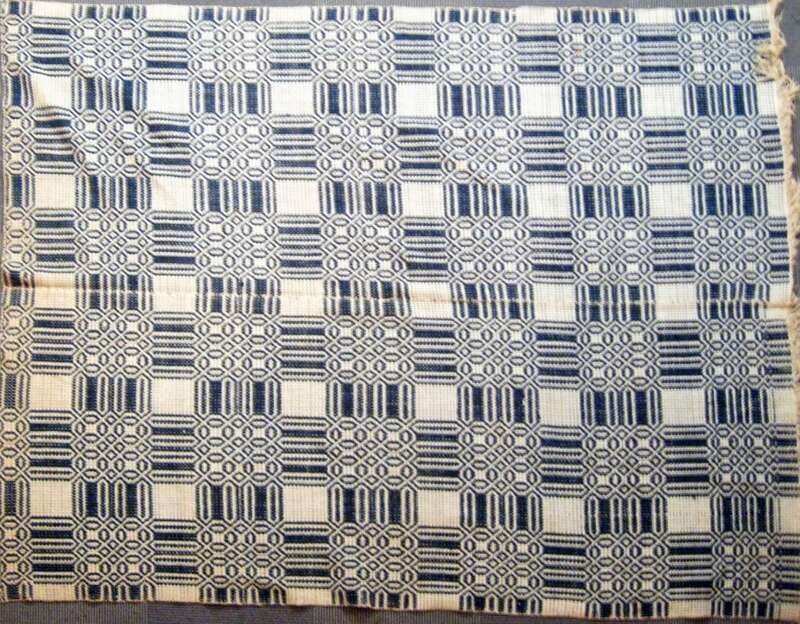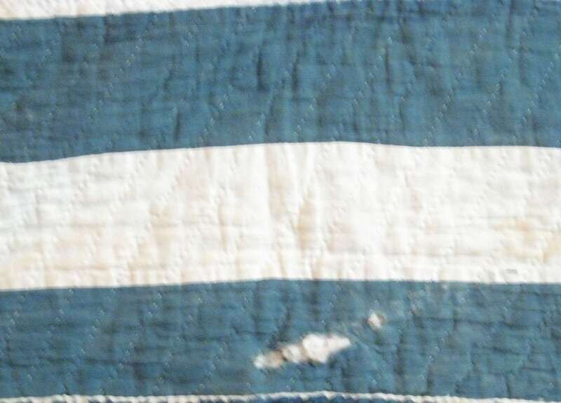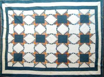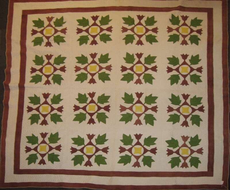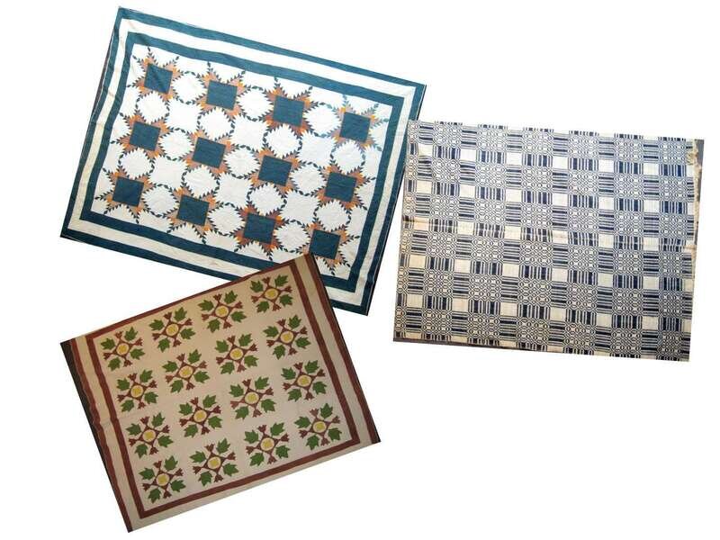 Comprising: a feathered star quilt in blue, brown and orange, a leaf and reel variation quilt in brown, green and yellow, and a geometric designed blue and white coverlet.