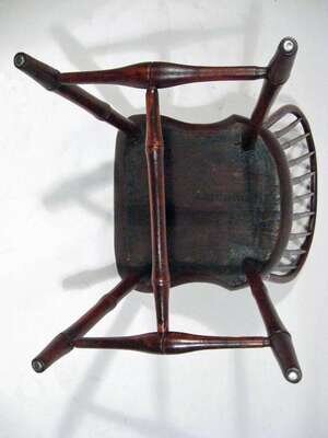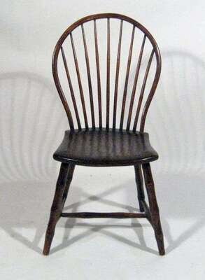 With nine bamboo styled spindles surrounded by a bow back; saddle seat on turned legs with H-form strecher.