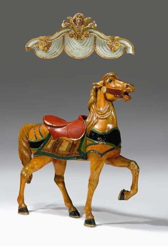 Carved and painted carousel stander horse and swag ornament attributed to philadelphia toboggan company, circa 1904-1934