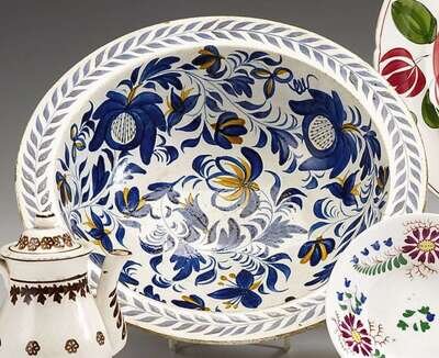 The rim flared with chevron pattern, the interior overall polychrome decorated with floral sprays, the exterior decorated with blue banding.