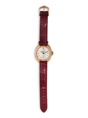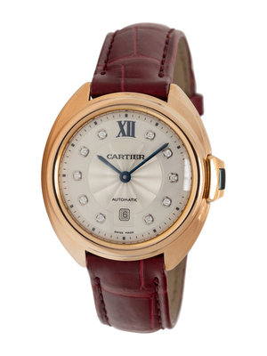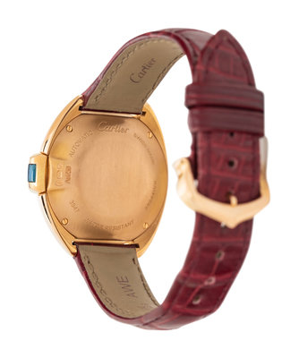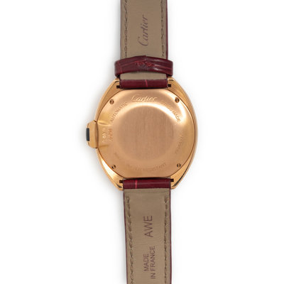 Bracelet/Strap: Burgundy leather with 18K yellow gold Cartier tang buckle