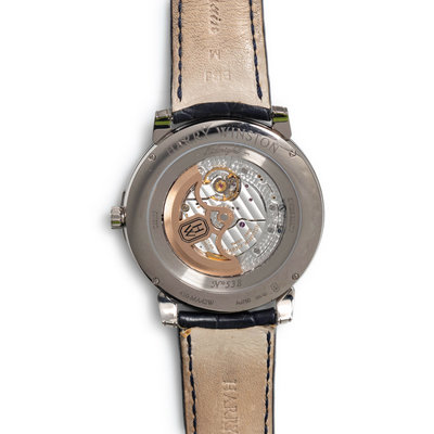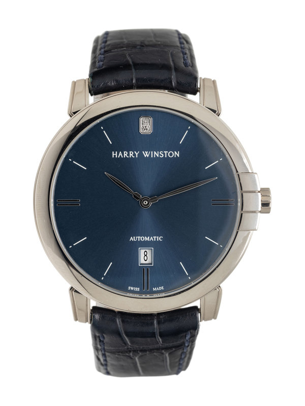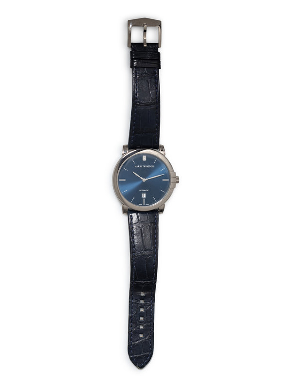 Bracelet/Strap: Dark blue leather with 18K white gold Harry Winston tang buckle