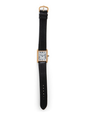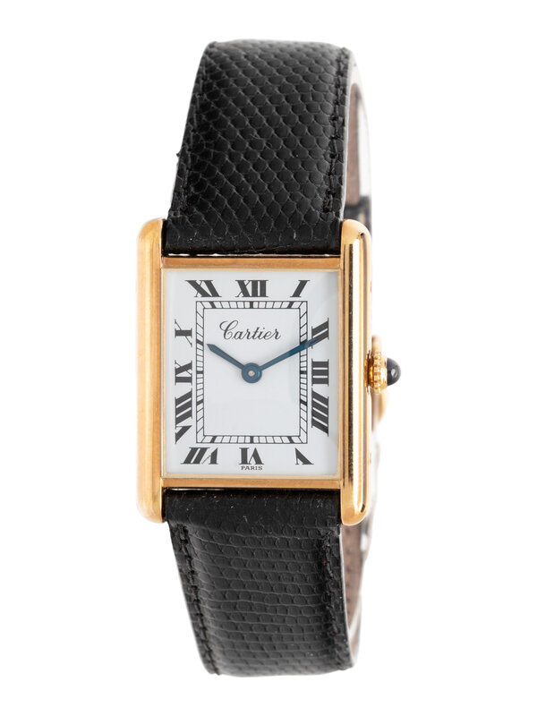 Bracelet/Strap: Black leather with Cartier tang buckle