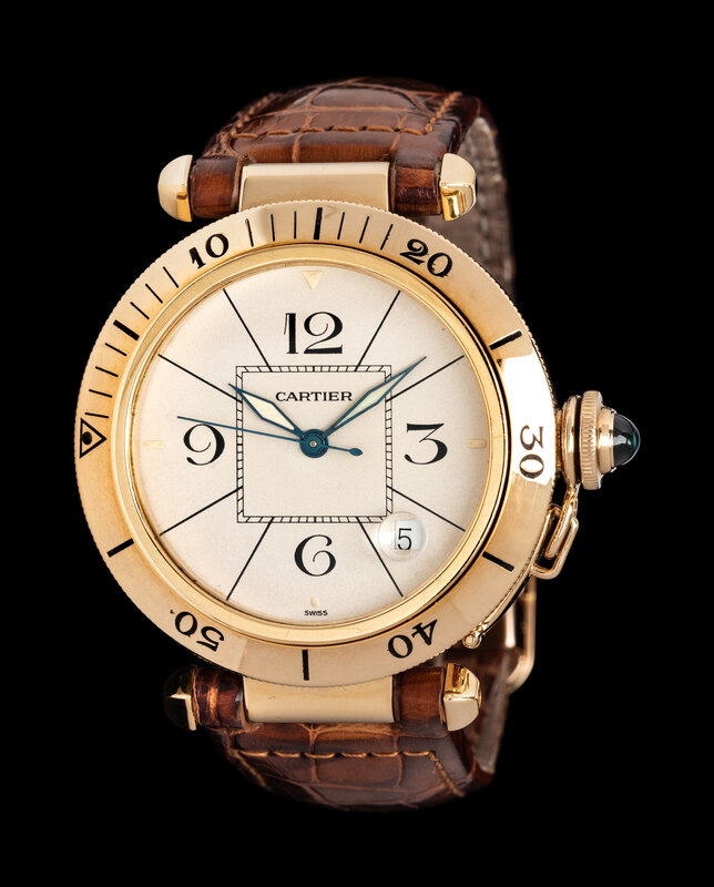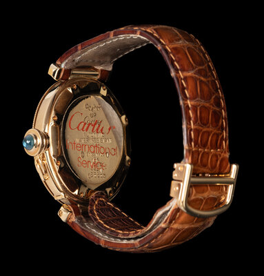 Bracelet/Strap: Brown leather with 18K Cartier deployant clasp