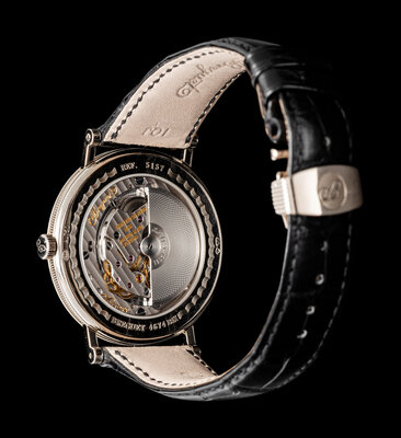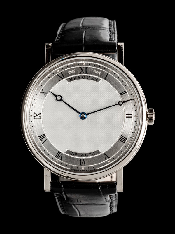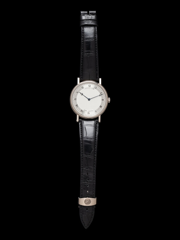 Bracelet/Strap: Black leather with 18K white gold Breguet deployant clasp