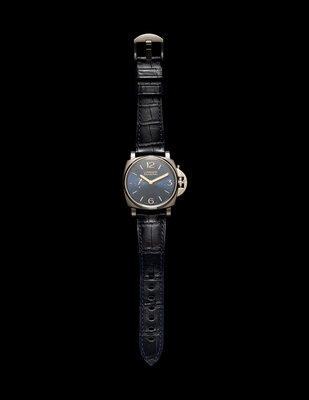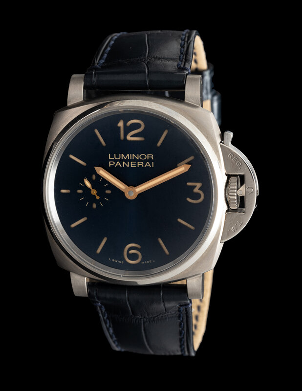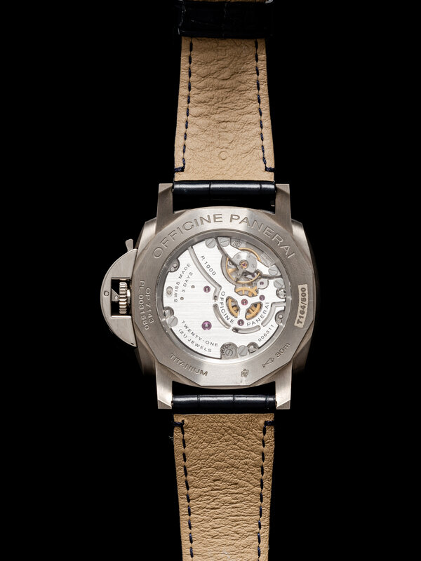 Bracelet/Strap: Black leather with titanium Panerai buckle