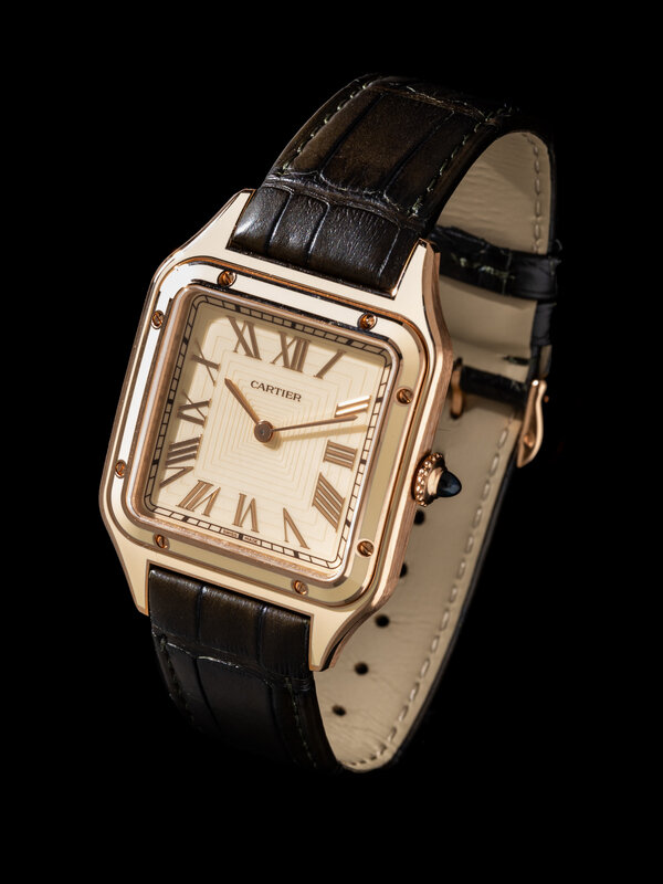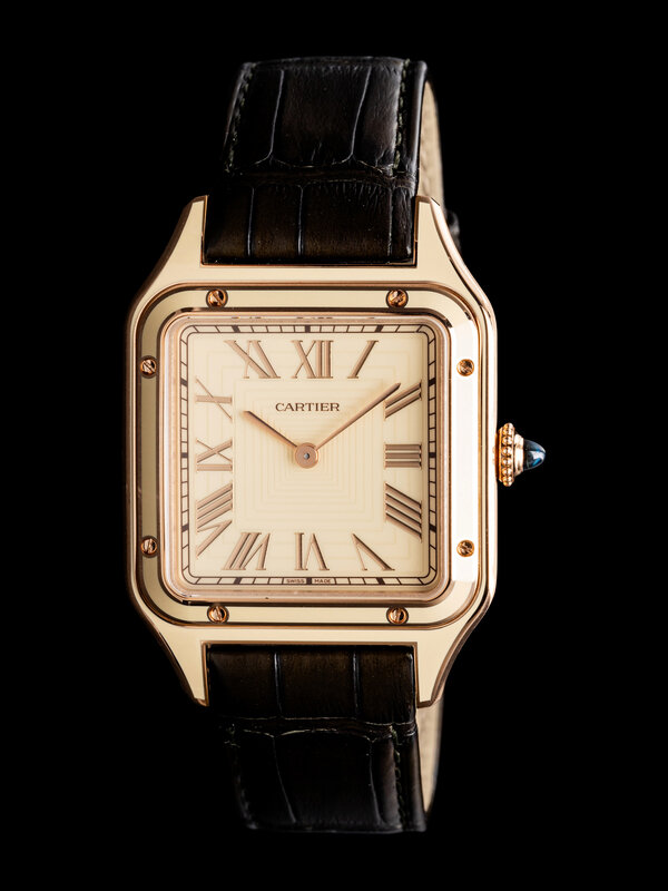 Bracelet/Strap: Dark green leather and 18K rose gold Cartier tang buckle