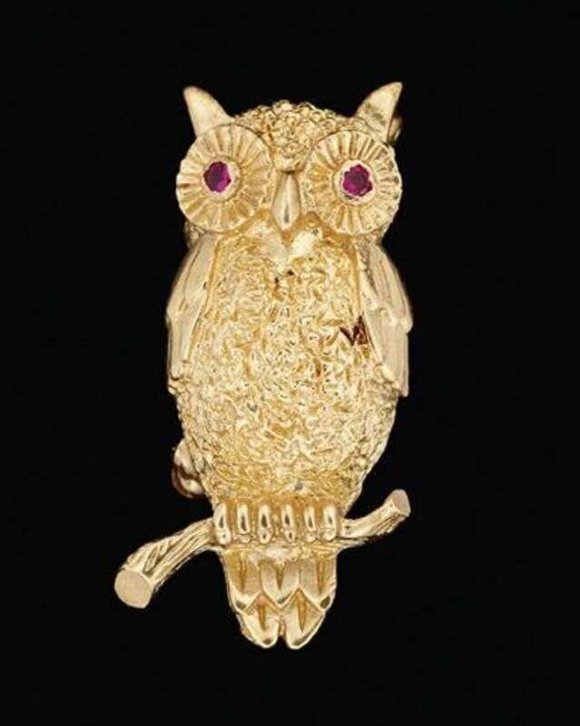 Whimsical perched owl on branch, circular cut ruby eyes.