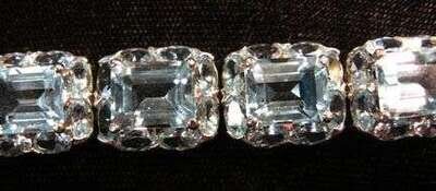 Eleven links of an emerald-cut blue zircon surrounded by oval blue zircons.