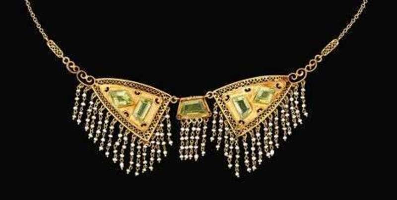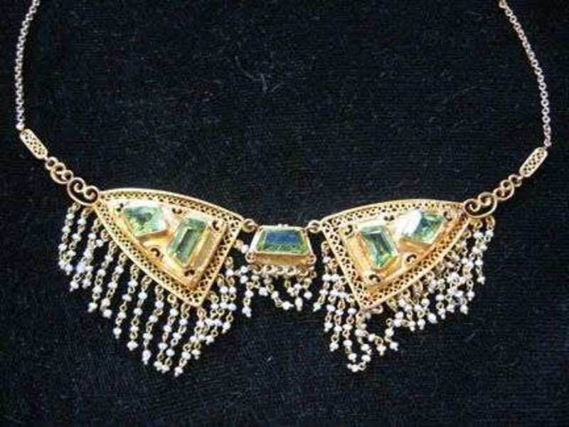14 karat yellow gold chain and gold filigree with five peridot stones and petite pearl fringe.
