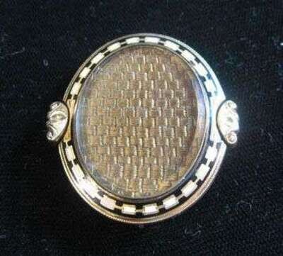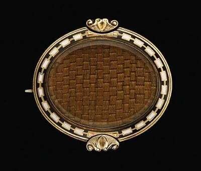 Woven hair under beveled glass lens, framed by black and white enamel over yellow gold.