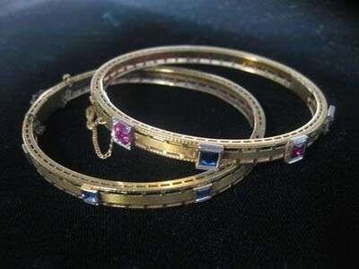 Two hinged bangle bracelets, each set with petite synthetic sapphire and ruby accent set into white gold beaded edge bezel setting.