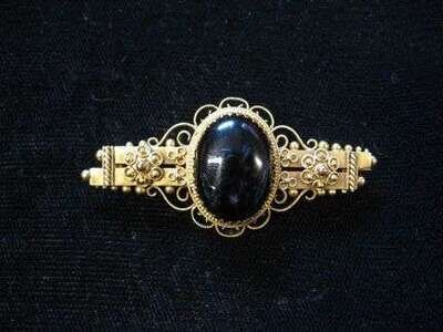 Featuring one large carbuncle garnet in ornate filigree setting, with extensive hallmarks on the reverse for unknown country of origin.