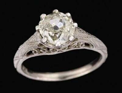1.40 carat Old Mine cut diamond prong set in antique filigree setting.