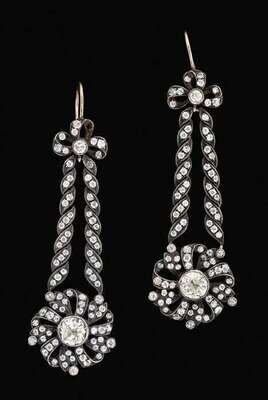 Diamond set white gold bow form followed by garland form ribbon twining toward diamond set flower form, setting centers on a single 1 carat old mine cut diamond. Total diamond weight in both earrings approximately 3.10 carats.
